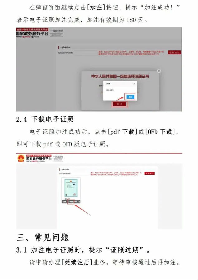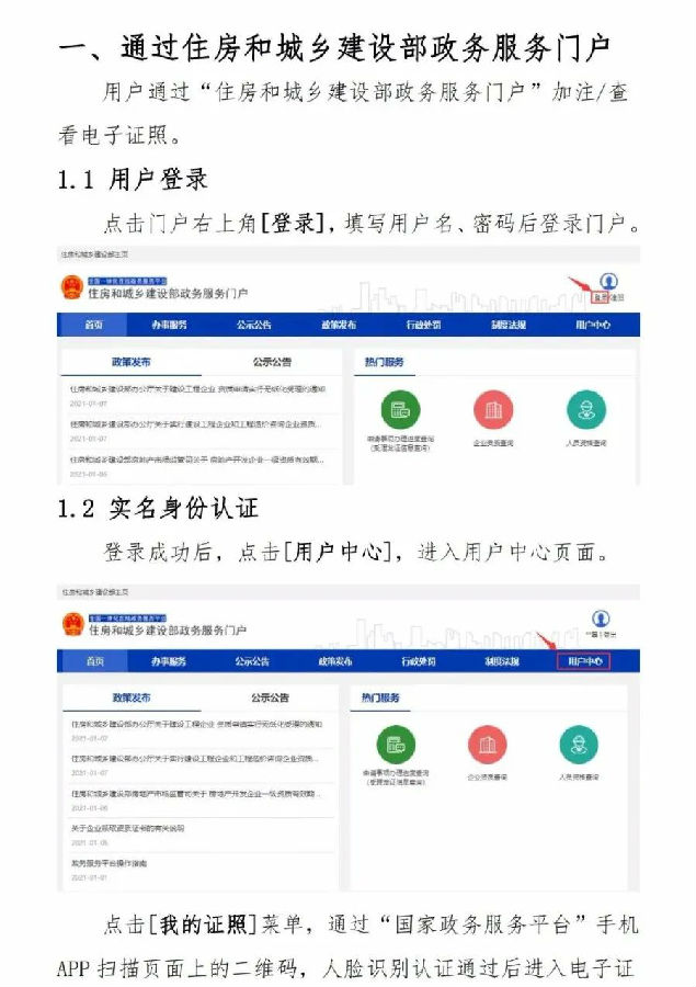 (一)一級建造師可登錄國家政務服務平臺、住房和城鄉建設部政務服務門戶查看和下載電子證書,具體操作流程可查閱《住房和城鄉建設部一級建造師電子證照申領和使用手冊》。查看和下載電子證書時,本人應確認該證書的使用時限。電子證書使用時限為180天,但使用時限距注冊專業有效期或建造師滿65周歲不足180天的,使用時限截止日期以注冊專業有效期截止日期或建造師滿65周歲當日為準。超出使用時限的電子證書無效,需重新下載電子證書并再次確認使用時限。