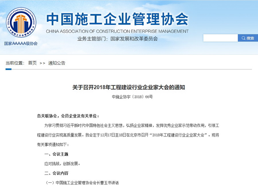 【轉發】中施企協關于召開2018年工程建設行業企業家大會的通知