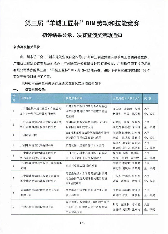 第三屆“羊城工匠杯”BIM勞動和技能競賽初評結果公示、決賽暨頒獎活動通知