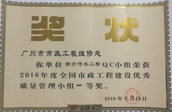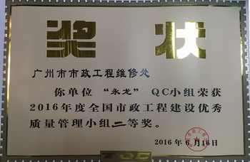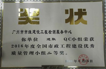 6月16日,中國市政工程協會向廣州市市政工程維修處及屬下市維建設工程檢測服務中心頒發了三項2016年度全國市政工程建設優秀質量管理小組獎項,其中:以提高水泥混凝土攪拌樁承載力合格率為課題的“南沙污水二標”QC小組獲一等獎,以降低落錘式彎沉檢測車“水泥混凝土接縫傳荷”檢測時間為課題的“進取”QC小組和降低混凝土裂縫頻率為課題的“永龍”QC小組均獲二等獎。(市政工程維修處)