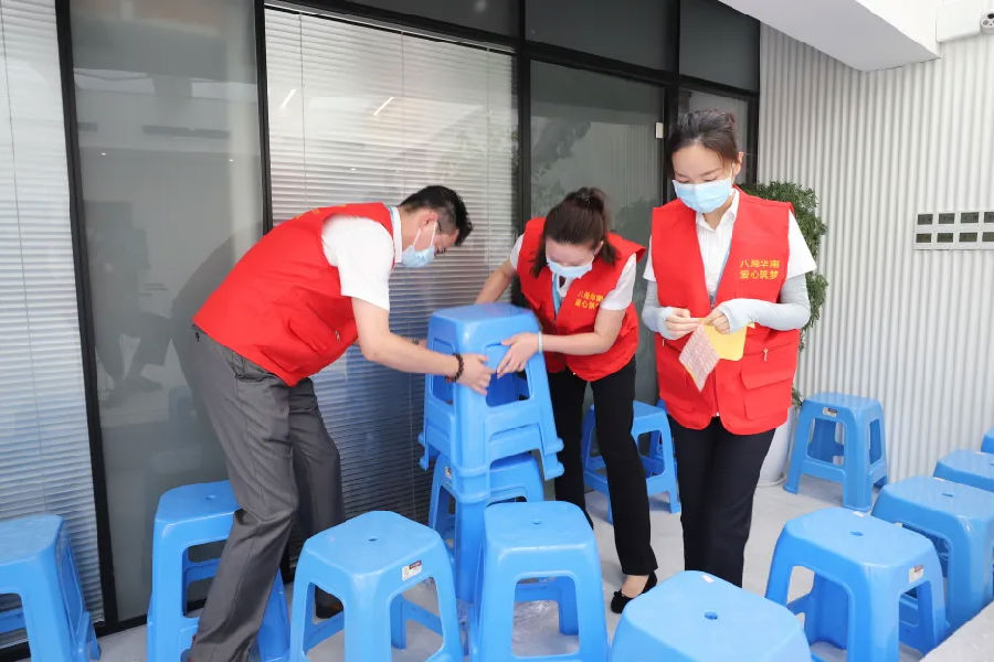 經過一天一夜的緊張準備,18日當日,“愛心筑夢團”自黨委工作部、辦公室、工會工作部、合約法務部、安全監督管理部等部門抽調十余名骨干,攜帶便攜座椅、飲用水等物資奔赴疫苗接種現場,迅速與街道辦黨組織對接。