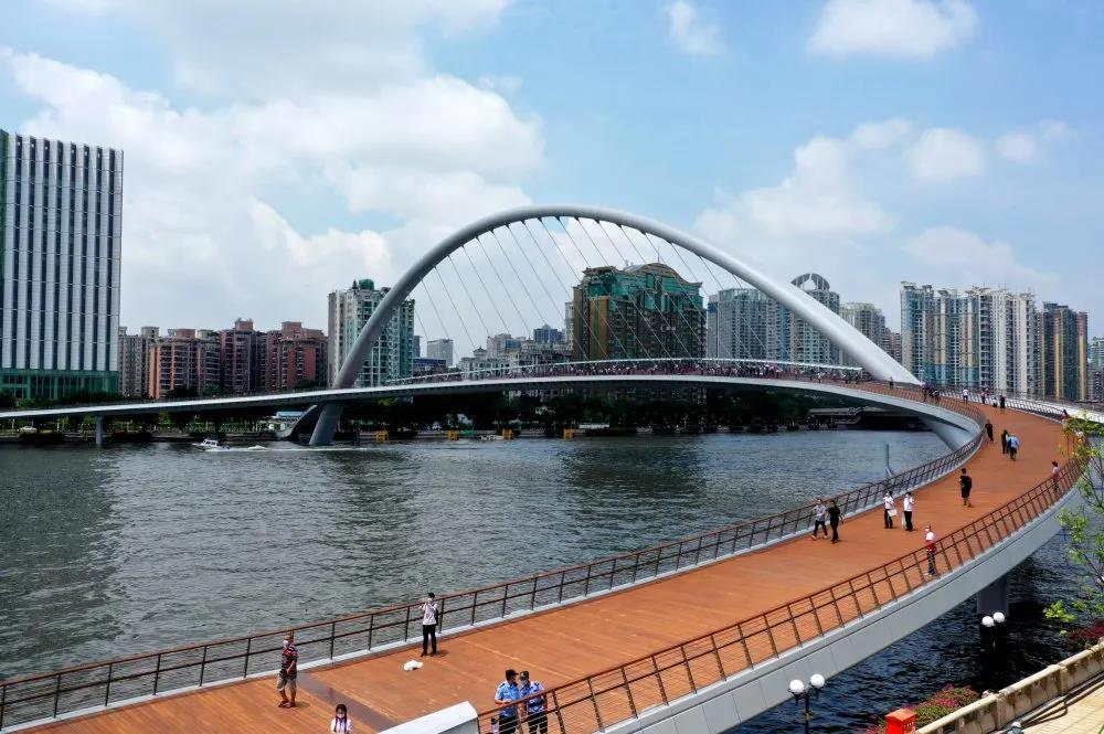 珠江秀水彩云間,長虹飛跨一色天。6月25日,由中鐵廣州局集團承建的廣州首座珠江兩岸人行橋正式開通,這是現今世界上跨度最大的曲梁斜拱人行橋,同時,其全球征名活動也最終揭曉,命名為:“海心橋”(小名:小鳳眼)。