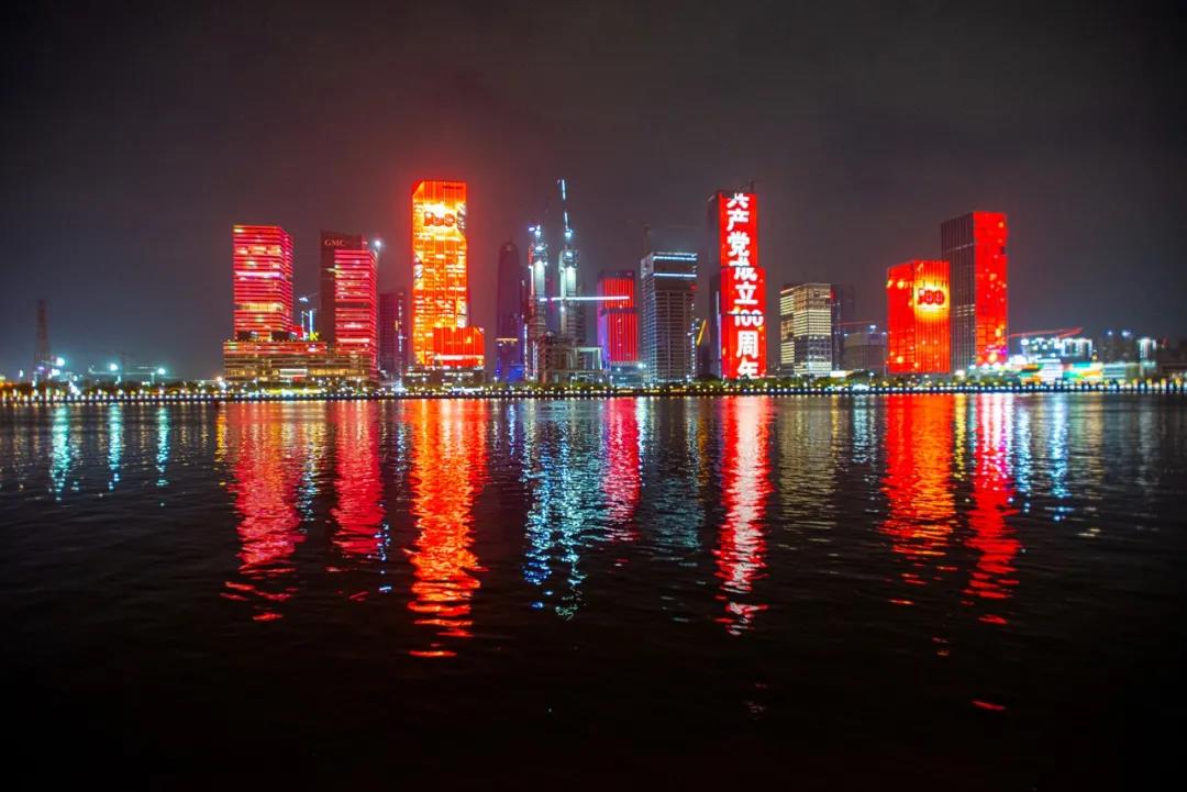 高樓上亮出“征途漫漫,惟有奮斗”“不忘初心,永遠跟黨走”“奮斗百年路,啟航新征程”標語,響應了習近平總書記在講話中強調的“銘記奮斗歷程擔當歷史使命,從黨的奮斗歷史中汲取前進力量”。現場燈光畫面不斷變換,并放映了1921年到2021年年份滾動等動畫點亮了珠江南岸線,以動畫視頻的形式回溯建黨百年史,歡慶建黨100周年。