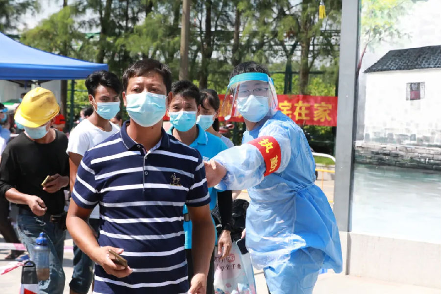 6月11日,廣州市南沙區(qū)珠江街開展第三輪全員核酸檢測,中鐵十九局集團(tuán)廣州工程有限公司高度重視,積極響應(yīng)當(dāng)?shù)卣栒伲⒓丛诠舅鶎偃f頃沙車輛段項(xiàng)目一工區(qū)、二工區(qū)、萬頃沙保稅港項(xiàng)目抽調(diào)職工志愿者51人,到核酸檢測點(diǎn)進(jìn)行疫情防控志愿服務(wù)工作。志愿者們用最短的時(shí)間完成防疫基礎(chǔ)知識培訓(xùn),提前到達(dá)核酸檢測點(diǎn),協(xié)助現(xiàn)場醫(yī)務(wù)人員,組織村民有序開展核酸檢測工作。