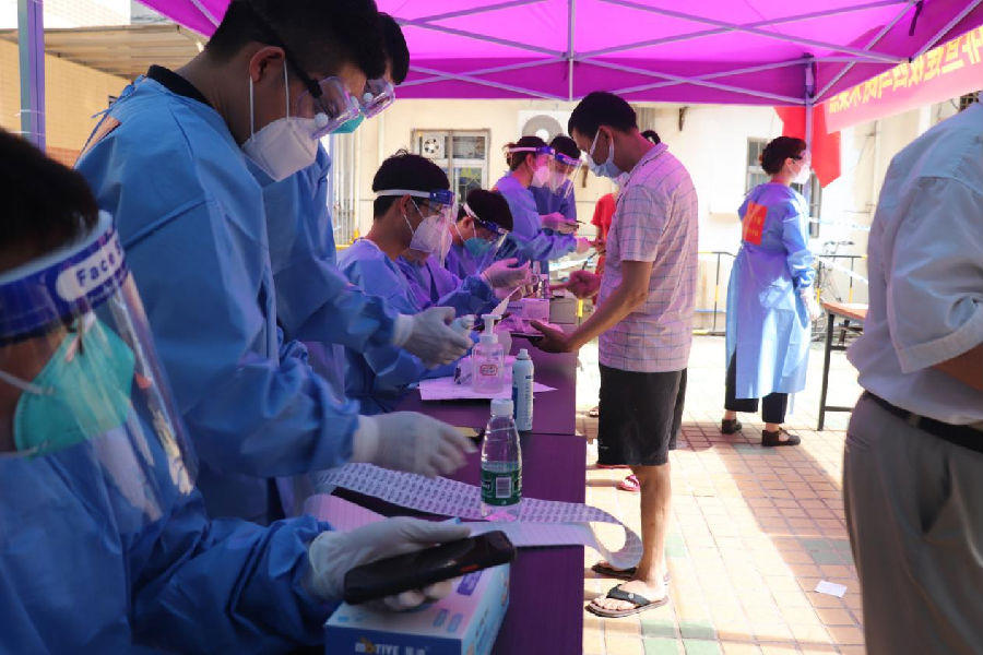 由于當(dāng)天人流量大,等候時(shí)間較長,志愿者們在做好采集點(diǎn)信息登記、維護(hù)秩序等工作同時(shí)安撫居民情緒,所有工作都在志愿者們的努力和居民的配合下有序快速地開展。當(dāng)天上午氣溫高達(dá)35℃,下午又下起滂沱大雨,但是這都不能阻擋醫(yī)護(hù)人員和志愿者們?nèi)娜鉃槿罕姺?wù),默默堅(jiān)守崗位到晚上12點(diǎn)。他們都是一個個普通人,卻用大愛撐起了一道“戰(zhàn)役防線”。