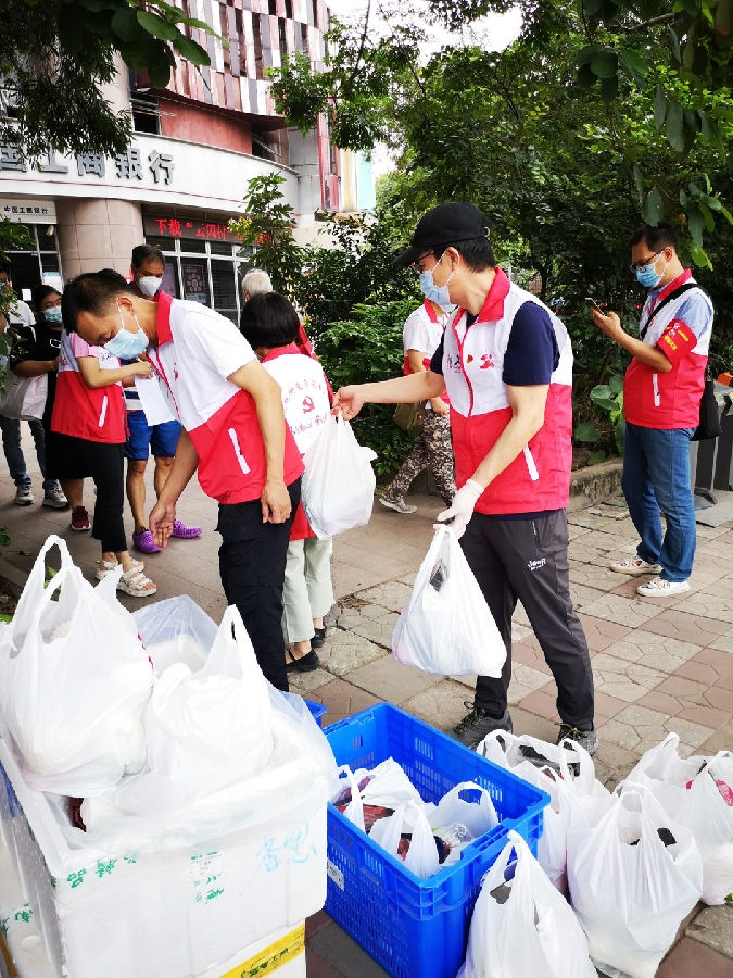 還有一些身處中高風(fēng)險(xiǎn)地區(qū)被居家隔離的同事,除了在家不斷為公司工作事物忙碌的同時(shí),心里依然牽掛著外面的疫情,主動(dòng)請(qǐng)纓參加本社區(qū)疫情防控志愿服務(wù),化身作一名抗疫一線的“后勤兵”。他們連日每天步行幾個(gè)小時(shí),手提“大白袋”,僅靠自己的喉嚨一遍又一遍地,在樓下呼喊,為家家戶戶及時(shí)送上新鮮的蔬菜食物等保障物資。黨員突擊隊(duì)馬甲里的他們,早已被汗水滲透,他顧不上擦汗,更顧不上喝水,聲音也變得沙啞了不少,一心只為群眾筑起一道“暖心墻”。