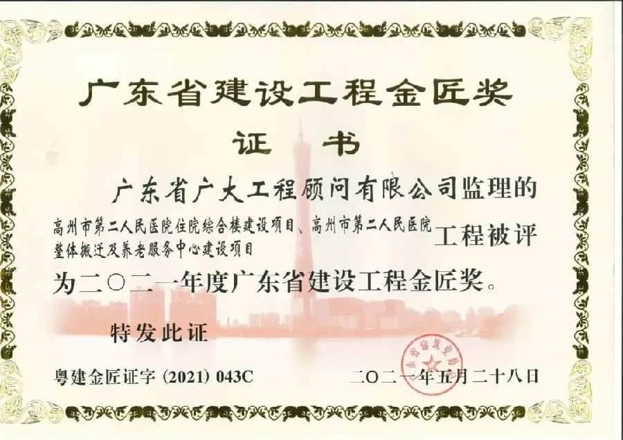 喜訊連連捷報傳,項目獲獎疊疊起。近日,由廣東省廣大工程顧問有限公司承監的“高州市第二人民醫院”項目同時獲得“2021年度廣東省建設工程金匠獎”、“2021年度廣東省建設工程優質獎”,兩項省級榮譽?!帮L華花園1~3棟住宅樓,4棟商業樓,辦公樓,5棟住宅樓,6、7棟商業樓,8棟門樓,9棟地下室"項目同時獲得“2021年廣東省建設工程優質結構獎”、“2020年廣東省房屋市政工程安全生產文明施工示范工地”。廣東省建設工程金匠獎是廣東省建筑行業工程質量的最高榮譽獎。