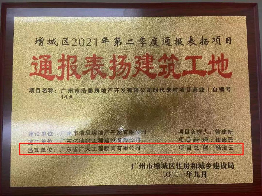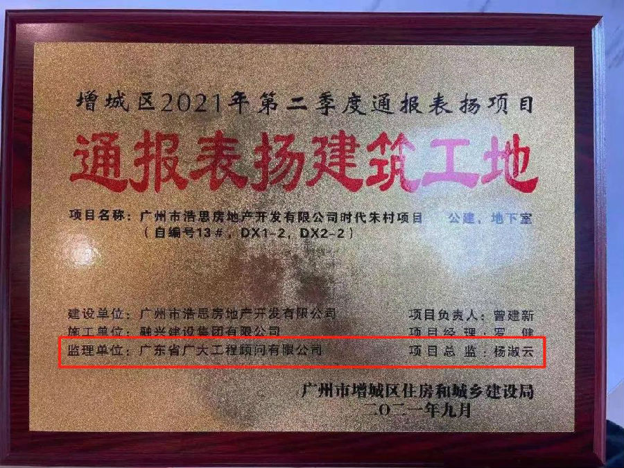 此外,由我司承監的時代朱村項目,公建、地下室(自編號13#,DX1-2.DX2-2)、時代朱村項目商業(自編號14#)項目,在2021年第二季度廣州市增城區住房和城鄉建設局開展的質量安全文明施工檢查中,榮獲“2021年第二季度通報表揚建筑工地”榮譽,在企業高質量發展道路上繼續邁出堅實步伐。