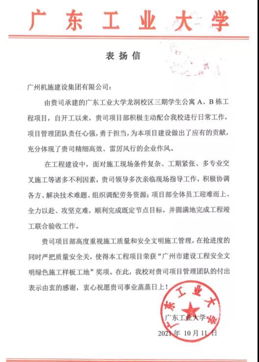 10月11日,廣東工業大學向我司致表揚信,對我司承建的廣東工業大學龍洞校區三期學生公寓A、B棟工程項目建設中所展現出的高水平施工作業與高效管理能力表示贊揚。