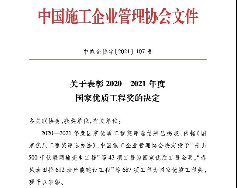 12月7日,中國施工企業管理協會發布《關于表彰2020-2021年度國家優質工程獎的決定》。其中,廣東金輝華集團共有2項工程榮獲國家優質工程獎。