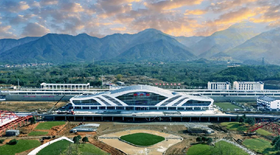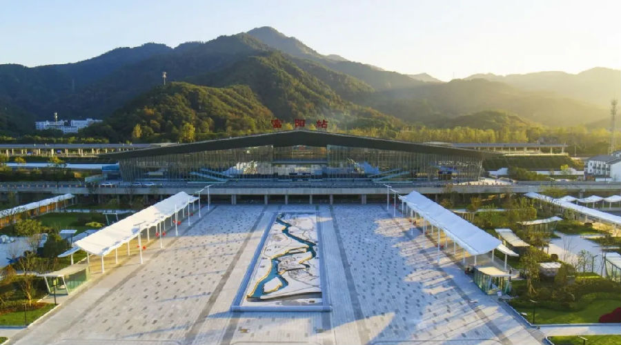 中鐵建設(shè)承建的杭黃鐵路富陽站、桐廬站是落實(shí)國鐵集團(tuán)鐵路客站建設(shè)新理念的首批站房。富陽站全線開工最晚、建設(shè)速度最快,站房充分融入富陽當(dāng)?shù)氐奈幕惋L(fēng)景,用現(xiàn)代化的建筑手法,演繹國畫里的焦墨運(yùn)筆,被譽(yù)為“把不可能變?yōu)榭赡堋薄M]站外立面造型為氣勢磅礴的大奇山形狀,玻璃幕墻與富春江兩相融合,采用智能引導(dǎo)系統(tǒng)、噴繪手法、“玉雕”工藝等新技術(shù)新工藝,完美詮釋山水桐廬。