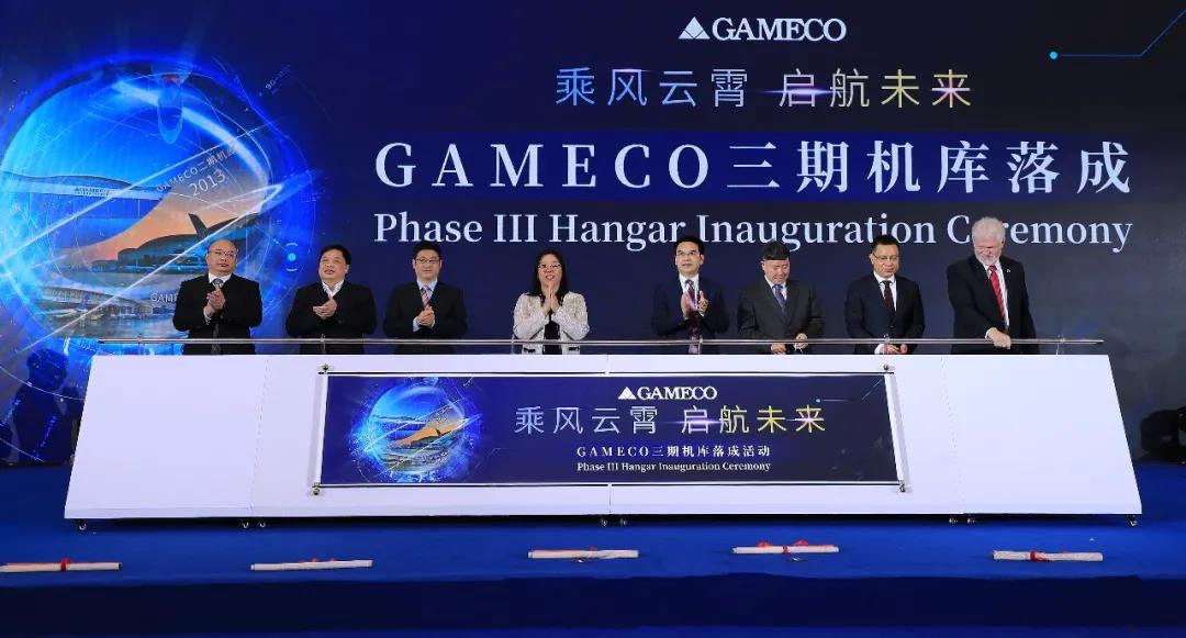 馬義俊與各政府單位、行業代表共同為醒獅點睛,并推桿開啟機庫大門,標志著GAMECO三期機庫工程正式啟用。