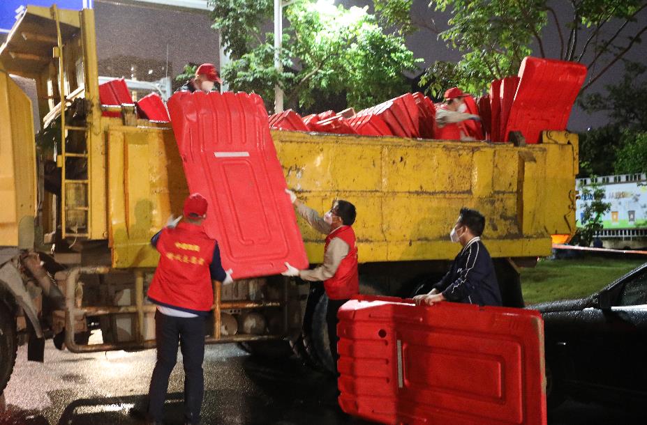 “機(jī)場三期安置區(qū)項目、中建百花城項目和信達(dá)珺悅藍(lán)庭項目負(fù)責(zé)白鱔塘封控點(diǎn)。”明確任務(wù)后,周波同中建百花城項目負(fù)責(zé)人羅五龍、信達(dá)珺悅藍(lán)庭項目負(fù)責(zé)人周而卓一起、投身前線,從4日凌晨1點(diǎn)堅守到清晨8點(diǎn),圓滿完成約5公里的水馬圍蔽任務(wù)。