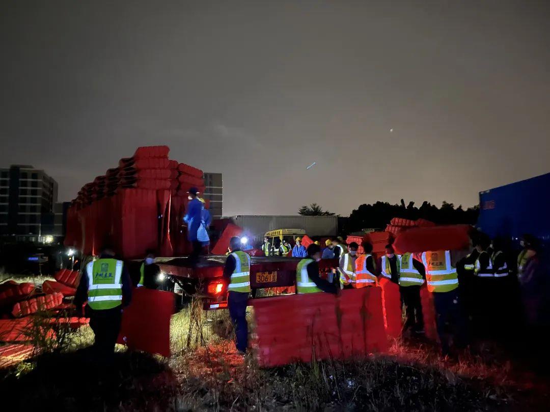 11月6日晚上10點,恒盛公司接集團公司通知,緊急支援白云區圍蔽任務。一呼百應,八方馳援,不到一個小時,300余人的隊伍迅速集結完畢,即刻趕往嘉禾望崗馳援防疫圍蔽建設,經過整夜作戰,于11月7日早上8點完成了近7.4公里的水馬圍蔽、注水及維護工作。
