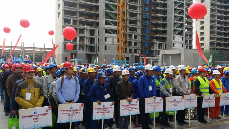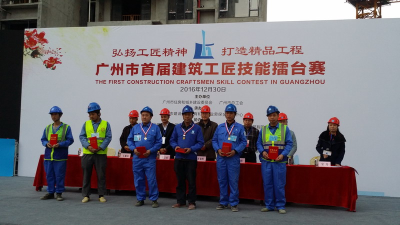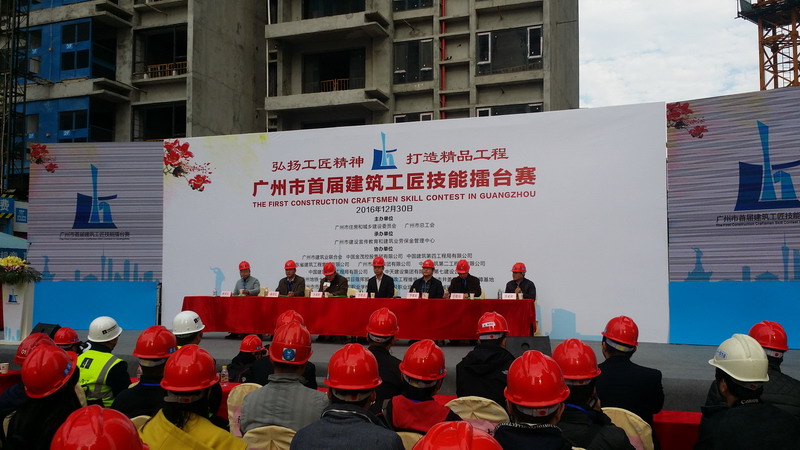 2016年12月30日,由市住房城鄉建設委和市總工會聯合主辦、市建設宣教勞保中心承辦、廣州市建筑業聯合會、中國金茂控股集團、中建四局、廣東省建工集團、廣州市建筑集團、中建二局、中建三局、中天七建、中鐵廣州地鐵十一號線項目指揮部、廣州市政工程維修處、廣州市政集團職業學校、廣州市建設職業培訓學校、廣州城建職業學院協辦的廣州市首屆建筑工匠技能擂臺賽在廣州荔灣區鶴洞路157號中建四局“珠江金茂府工程項目部”順利開幕。市住房城鄉建設委副主任李朝暉代表擂臺賽組委會簡要介紹了本次比賽的籌備情況,市總工會副主席李德球宣讀了市人大常委會副主任、市總工會主席、省總工會副主席趙小穗的賀信,市政府副秘書長張曉波出席了開幕式并講話。我們王德山副秘書長、常桂枝副秘書長代表我會參與本次活動。
