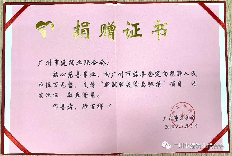 為支援抗擊新型冠狀病毒感染的肺炎疫情,我會在努力做好本單位防疫工作的同時,積極履行社會責任奉獻愛心和力量。日前,我會通過給廣州市慈善會捐款伍萬元防疫善款,參與抗擊疫情阻擊戰中,貢獻自己綿薄之力,助力抗疫難關。