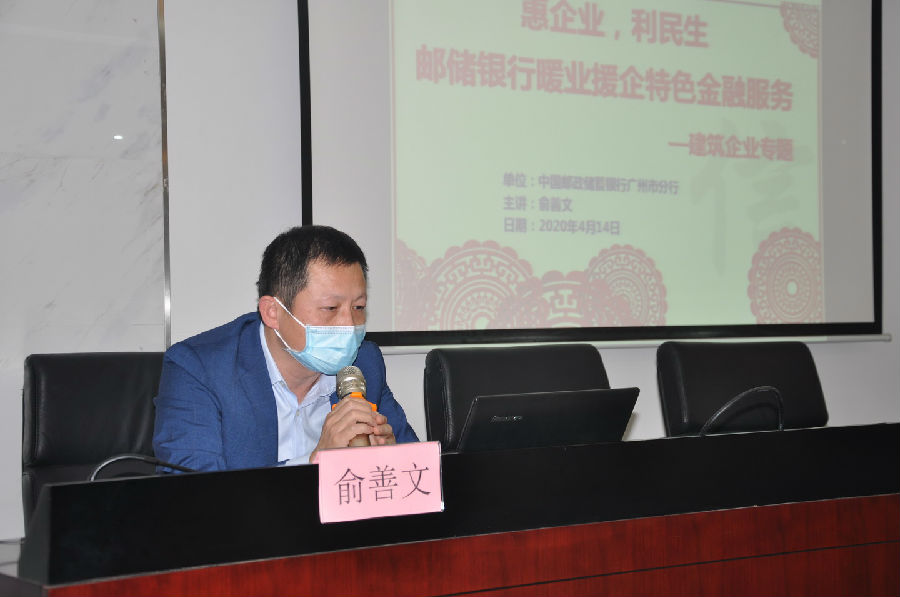 金融專業服務組專家、中國郵政儲蓄銀行廣州市白云支行行長俞善文進行“惠企業,利民生”暖業援企特色金融服務建筑企業專題講解,具體介紹了建筑工人工資分賬管理項目以及綜合金融配套服務,銀行專屬服務團隊將積極響應政府關于加大金融對企業支持力度的號召,通過多維立體式服務,全力保障企業生產和民生需求。