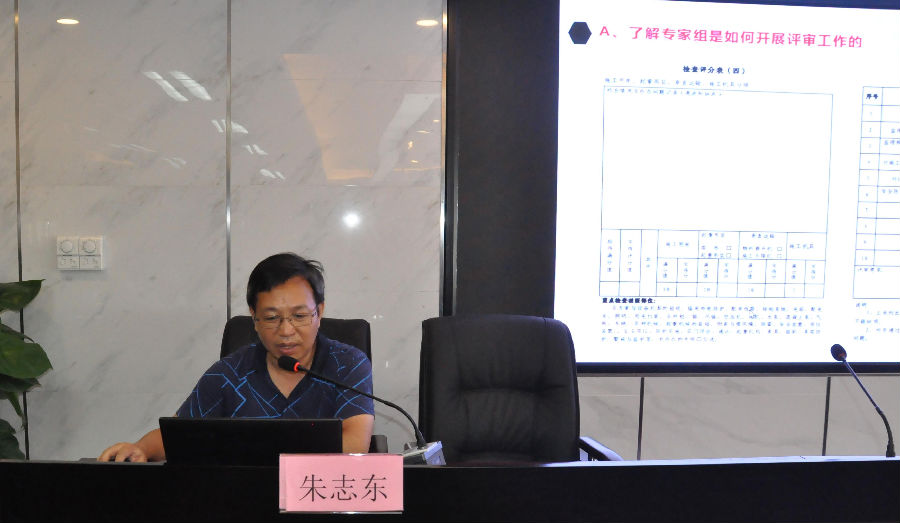 朱志東對2021年上半年省示范工地迎檢需要注意的事項進行了詳細講解,主要分為兩部分內容:一是了解專家組是如何開展評審工作;分別從評審依據、評審專家組分工、評審程序、資料和現場檢查的主要內容等方面舉例說明;二是項目有針對性地做好迎檢工作,分別從迎檢重視程度、人員分工、資料分類組卷、匯報材料注意事項、現場檢查路線布置、現場文明施工以及如何更好地展示工程自身亮點等方面對施工單位管理人員進行了指導。