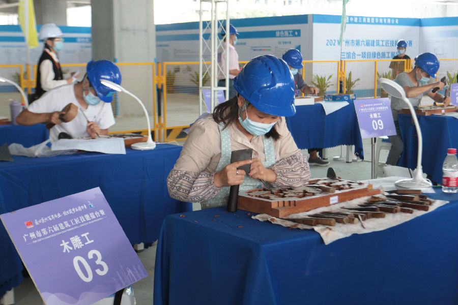 本屆擂臺賽繼續(xù)引入嶺南傳統(tǒng)建筑技藝,作為廣東省省級非物質(zhì)文化遺產(chǎn)項(xiàng)目的木雕首次“亮相”比賽現(xiàn)場,嶺南特色、民間工藝元素為大賽增添了別樣韻味。受大賽組委會委托,我會邀請廣東省省級非物質(zhì)文化遺產(chǎn)潮州木雕代表性傳承人陳德豐到現(xiàn)場展示精湛技藝,為選手和大師之間搭建起溝通交流的渠道,大力弘揚(yáng)工匠精神。