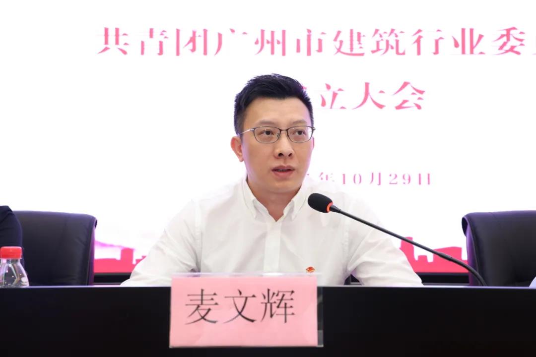 團市委基層組織建設部部長、市兩新團工委專職副書記麥文輝首先對市住建局團委、廣州市建筑業聯合會及各相關企業精心籌備成立行業團委工作表示感謝,對廣州市建筑行業團委揭牌成立表示祝賀。他指出,共青團是中國共產黨領導的先進青年的群團組織,在我市建筑業規模不斷壯大的背景下,抓住全市行業團建系統試點工作的寶貴機遇,推動成立建筑行業團委,是貫徹落實習近平總書記關于“青年在哪里,團組織就建在哪里”重要指示要求的具體行動,對鞏固和擴大全市建筑行業青年群眾基礎,促進青年健康成長、建功立業有著極為重要的政治意義。他對行業團委提出三點希望:一是加強思想引領,努力培養信念堅定、理想崇高的新時代青年;二是服務行業發展,努力培養銳意進取、甘于奉獻的新時代青年;三是夯實團建基礎,努力培養爭當先進、垂范表率的新時代青年。他希望各位團員青年能夠時刻銘記習總書記的囑托,牢記使命,付諸行動,用青春的肩膀扛起時代的重任,希望廣州市建筑行業團委能夠發揮好橋梁紐帶作用,不斷推進和創新團委工作,為實現廣州市建筑業高質量發展、老城市新活力、“四個出新出彩”和在習近平總書記賦予廣東的使命任務中勇當排頭兵作出積極貢獻。