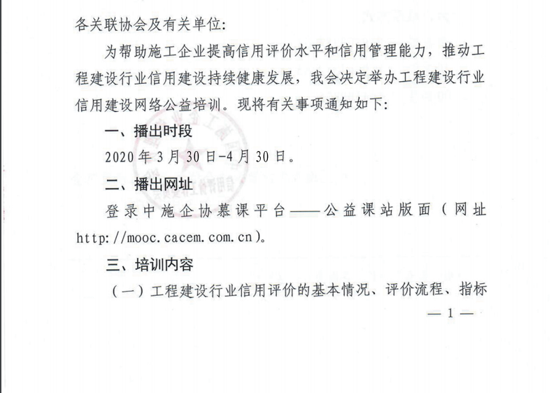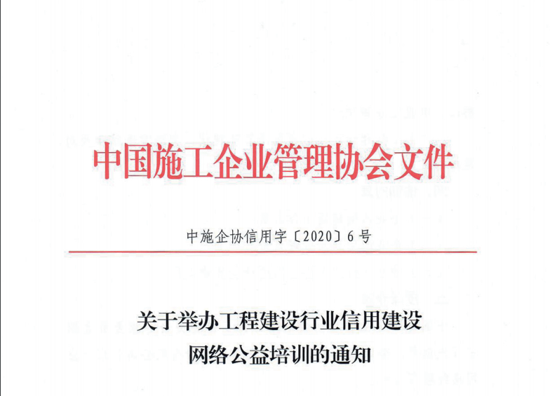 各有關會員單位 : 為幫助施工企業提高信用評價水平和信用管理能力,推動工 程建設行業信用建設持續健康發展,中施企協舉辦工程建設行業 信用建設網絡公益培訓 ,請有關會員單位積極參與。(詳情請查閱附件)