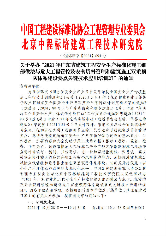 文件:關于舉辦“2021年廣東省建筑工程安全生產標準化施工細部做法與危大工程管控及安全資料管理和建筑施工雙重預防體系建設要點關鍵技術應用培訓班”的通知