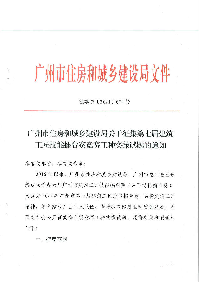 【轉(zhuǎn)發(fā)】廣州市住房和城鄉(xiāng)建設(shè)局關(guān)于征集第七屆建筑工匠技能擂臺(tái)賽競(jìng)賽工種實(shí)操試題的通知