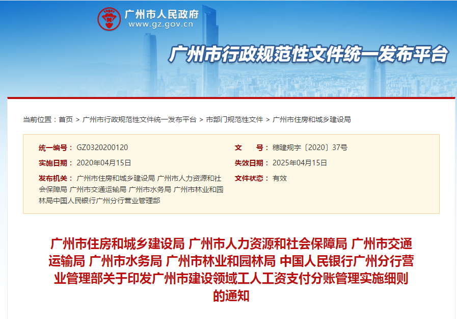 第二十七條 本辦法自2020年4月15日起施行,有效期五年。《關于印發廣州市建設領域工人工資支付分賬管理實施細則的通知》(穗建規字〔2017〕10號)同時廢止。